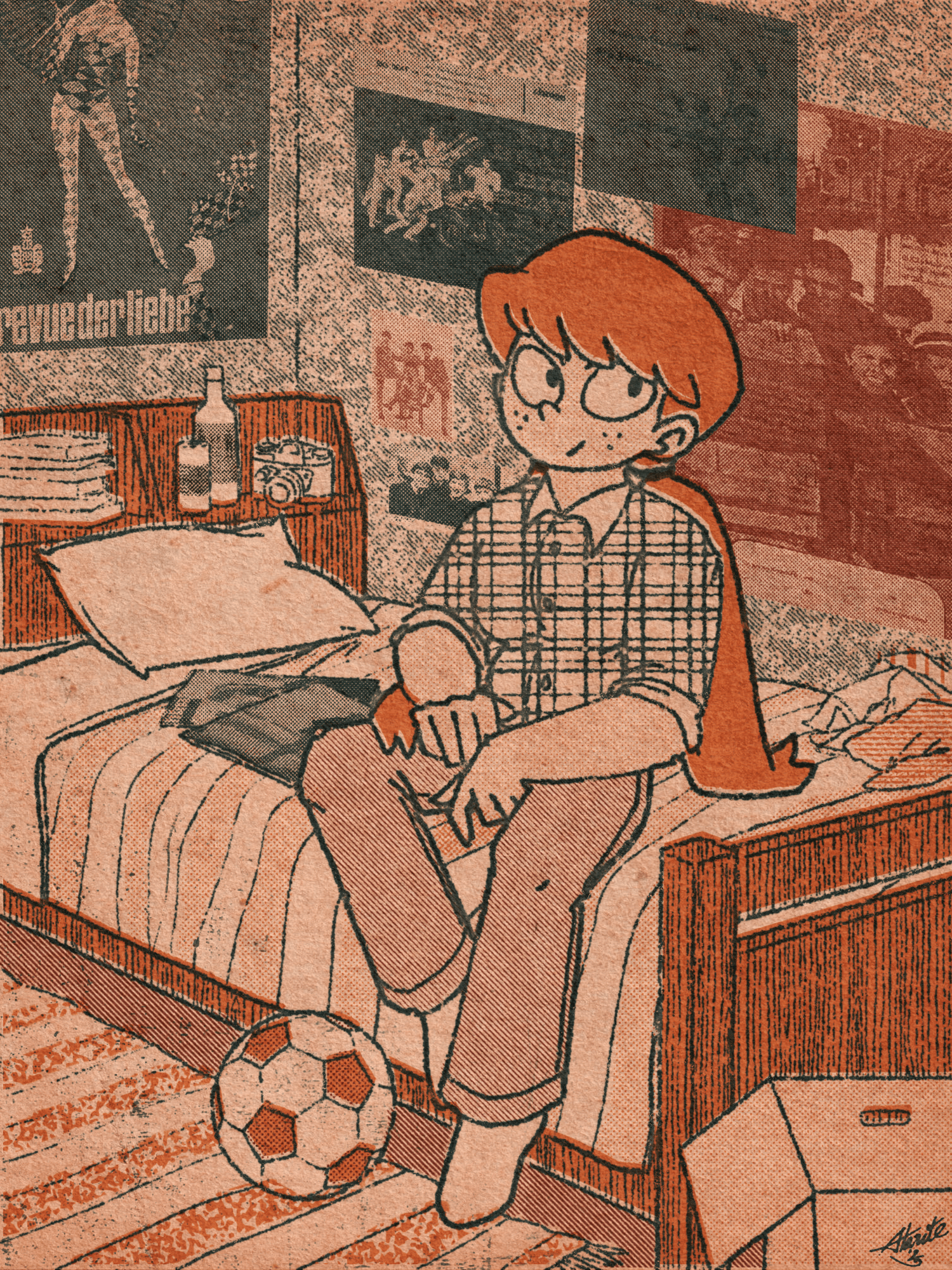 Pictured: Renate Michaelis sitting in her bedroom, ca. mid-1960s. She is surrounded by multiple cultural artifacts marking her as a young woman who keeps up with the times. She also has a somewhat rebellious streak, as evidenced by her jeans and the Beatles postcards by her pillow - both considered symbols of Western decadence in her home country! Could that explain her smirk?This piece was something of an adventure in both compositing and drawing detailed backgrounds. As always, the most entertaining part of the process was covering everything in different textures and patterns.